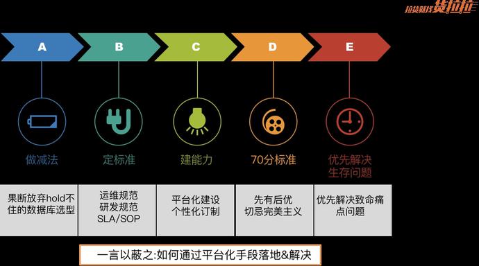 过去是完全没有规范的或者错误的规范,同时我们要明确DBA的职责及SLA保障标准,目的就是告诉研发该做什么不该做什么(比如研发过程使用某种我们不支持的数据库则不准上线!)及各种要遵循的规范化的内容。DBA提供SLA保障标准也是对DBA严格要求,通过建立规范标准让DBA有“法”可依,最起码也是起到保护DBA的作用。规范的建立如果只是文字性的内容往往是没有意义的,必须是能写进代码里同时也要做好系统收口才能良好的执行,否则就是一纸空文(只有在跟产研打官司的时候有用,只是不希望发生这种情况),因此平台化是非常必要的。