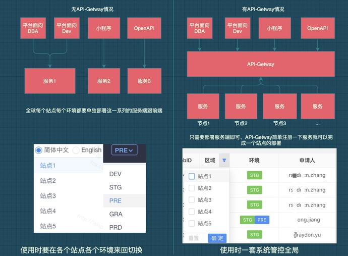平台在设计之初就考虑到多站点的统一管理问题,我是非常不希望看到一套系统在各个站点反复部署的使用体验简直不要太差!这里是稍微介绍一下为什么需要统一网关如图: