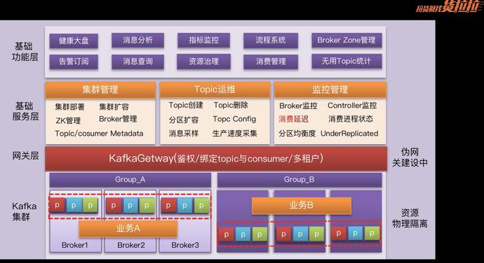 前面提到,我们现在所有的资源交付都是通过资源id进行交付的,研发也必须只能通过资源id才能访问到Kafka,因此我们网关就基于这个点进行建设:用户的consumer必须在DBA交付的资源ID中建立topic跟consumer的绑定关系,用户在拿资源id时需要对其指定的password/topic跟consumer进行绑定关系验证(框架对kafka client做了封装)否则就拿不到资源id,当然这个实现肯定是不完美的,聪明的研发肯定能想到办法绕过,比较理想的做法就是将绑定关系内置到kafka server中,但是目前由于还没有精力进行这方面的投入。