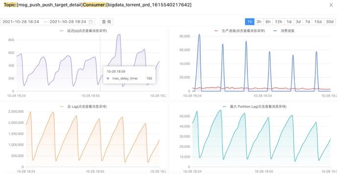 一般的kafka延迟通常以lags来衡量,但是lags最大的问题在于难以做时间维度的量化,以至于难以判断延迟的真正程度,也不方便提供研发订阅(研发需要知道自己消费延迟情况但是lags对研发不够直观友好),比如上图lag=250k表达出来的意思就不如延迟时间=600s来的直观,基于时间的延迟实现我们在提供研发做报警订阅时就有了直观的衡量标准。
