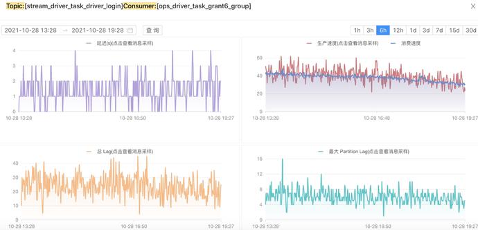 但是受到kafka HW及consumer延迟commit的影响要获取consumer的精确延迟时间是不可能的,以上图为例这是典型的大数据消费处理的特征:消费一批数据后在做commit,这时我们观察到他的延迟时间就跟commit时机有非常大关系,呈现出了周期性波动,但是实际上延迟的真实时间是小于600s的,但是受到上述机制的影响我们没有办法做精确计算。