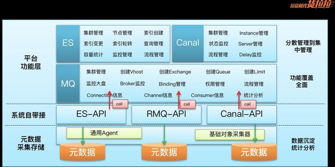 ES,Canal,MQ其自身的可观测不是特别的好。不过好在他们都再带了自己的web-admin这就给实现集中式管理提供了可能,除了我们通过分析起web-admin api将其关键元数据缓存之外我们DMS平台的诸多功能都是对现有web-admin的api的调用实现,一种非常取巧的实现方式。同时元数据的采集也对我们更好的维护治理这些基础中间件提供更好的依据。