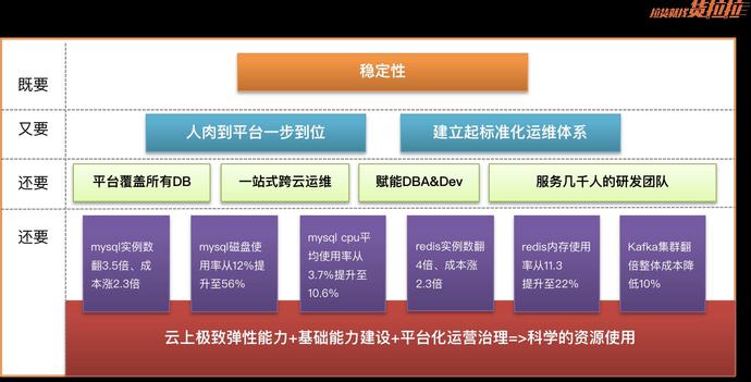 经过一年的马不停蹄,虽然数据库类型很多但是我们还是基本上完成了每款数据库及中间件的核心功能的建设工作,但是我们并没有考虑跟进一步走向所谓的智能化阶段,应该来说目前业内呈现的智能化还是一个很虚的概念真正付出实践的太少了,或者大多数都是基于规则引擎的更高程度的自动化,对于一些体量不大公司基本上属于KPI驱动的产物。对于当下货拉拉我觉得比较务实的举动就是实现运维的数字化运营这是当前正在做的方向,其实也比较简单就是基于平台的数据沉淀对核心指标进行展示体现出整体稳定性治理的趋势,云上资源利用率分布变化等等。
