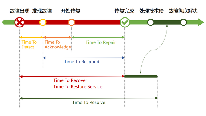 下面是单个生产事件从故障发生到修复完成的简要示意图,根据起止时间点的不同,将获得若干个 MT 指标。
