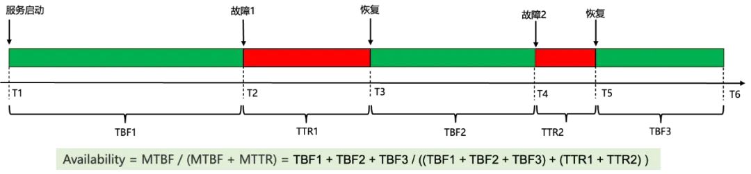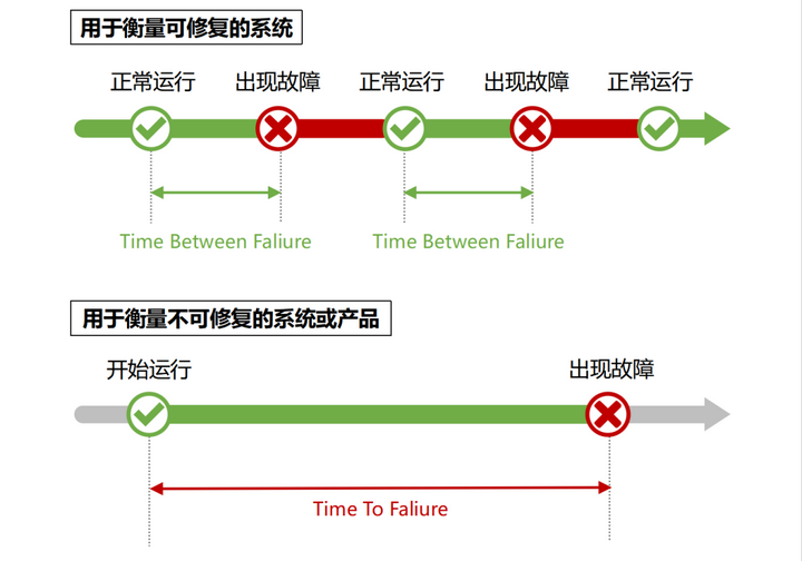 平均无故障时间(MTBF)是衡量系统可靠性和可用性的关键指标之一,指可修复系统在运行期间从前一个故障(结束)到下一个故障(出现)所经历的平均时间,代表了系统的平均可用时间。