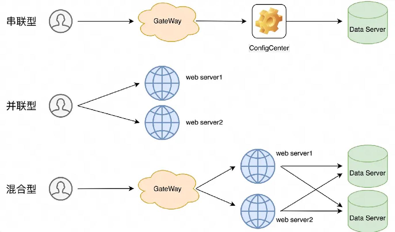 并联型:服务拓扑链路中,不存在单点依赖,某一子服务不可用不影响整体服务可用性。以服务可用性为例,串联服务可用性计算公式为: