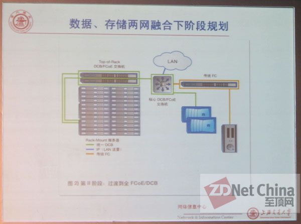 据了解,上海交通大学目前采用了NetApp、HDS和Sun StorageTek等传统存储系统,如何继续保留和使用这些系统,最大限度地保护已有投资,同时积极引入尝试DCB和FCoE等新技术,是上海交通大学遇到的首要挑战。在这种情况下,黄保青的小组还考虑到了在DCB上实现存储网络和数据网络的“两网融合”,简化数据中心网络架构,构建一个完善的跨校园多数据中心灾备系统。