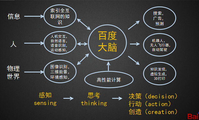 此时,百度从为用户提供搜索结果的搜索引擎开始转变为向用户提供全方位解决方案的人工智能,想象力无穷。那么,百度大脑将会如何模仿人类的感知,再到思考,以至于最后产生决策、生产、创造呢?