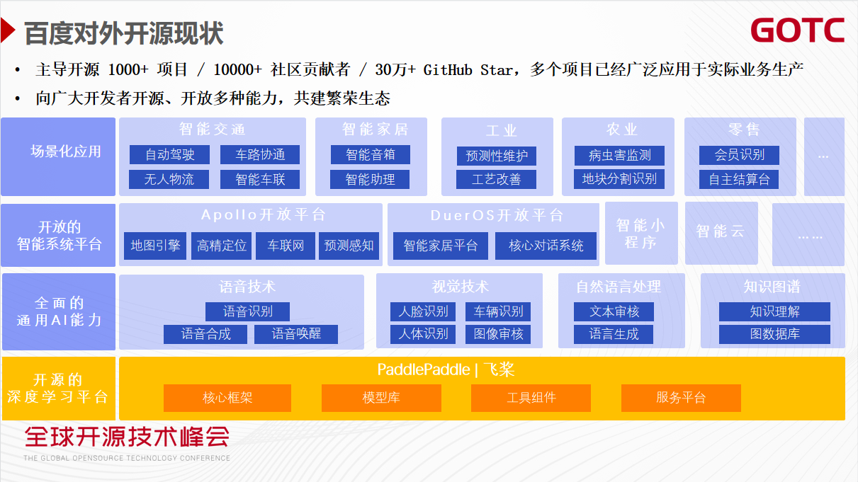 截至目前,百度共主导开源 1000+ 项目、10000+ 社区贡献者、30万+ GitHub Star,多个项目已经广泛应用于实际业务生产。