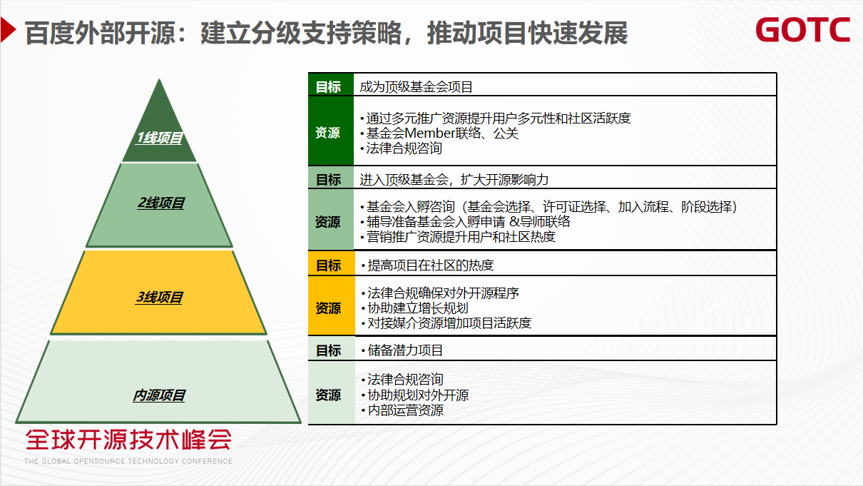 对于外部开源项目,百度建立了分级支持策略,推动项目快速发展。