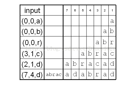 | 窗口 | 未压缩 | 相同字符串 | 相同字符串起始位置 | 相同字符串长度 | 相同字符串后一字符 | 压缩码 |