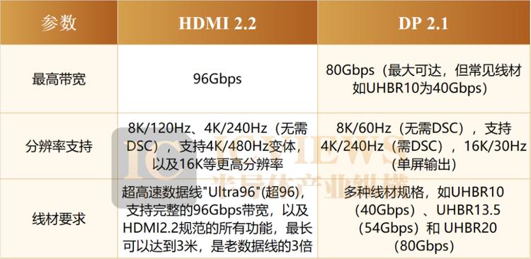 HDMI 2.2和DP 2.1作为两种先进的数字显示接口标准,各自拥有独特的参数和采用的相关技术。以下是对两者的详细对比: