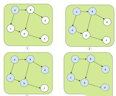 ① 种子节点是A ② A节点选择B、C节点进行散播 ③ C散播到D,B散播D和E,可以发现D收到两次 ④ D散播到F,最终整个网络都同步到了消息