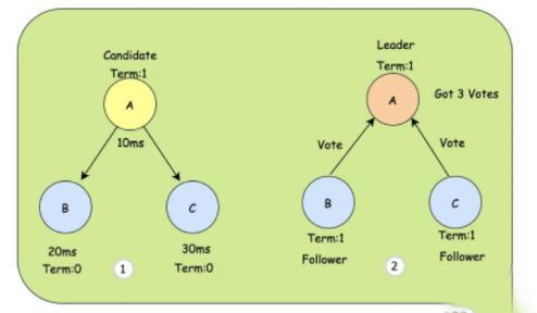 ① 由于A节点的定时器时间最短(10ms),所以A会成为Candidate。