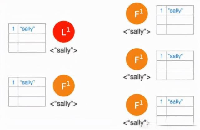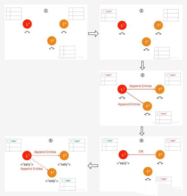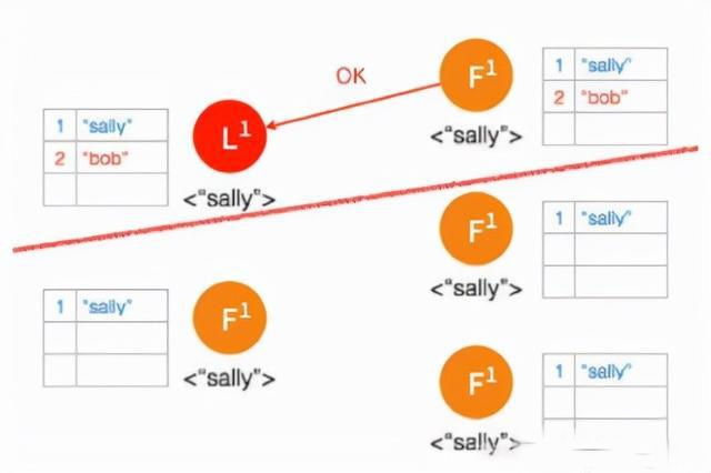 ④ Follower 将数据写到本地后,返回 OK。Leader 收到后成功返回,只要收到的成功的返回数量超过半数 (包含Leader),Leader 将数据 “sally” 的状态改成 Committed。( 这个时候 Leader 就可以返回给客户端了)