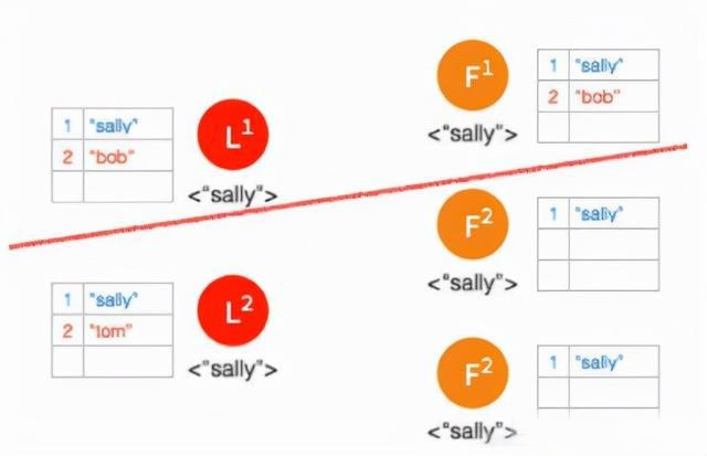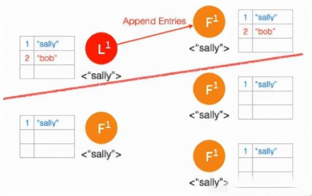 ③ 两个节点这边已经有 Leader 了,来自客户端的数据 “bob” 通过 Leader 同步到 Follower。