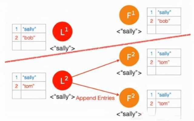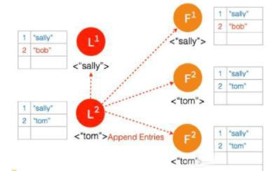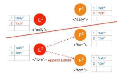 ⑨ 两个节点 Partition 的 Leader 自动降级为 Follower,因为这个 Partition 的数据 “bob” 没有 Commit,返回给客户端的是错误,客户端知道请求没有成功,所以 Follower 在收到 AppendEntries 请求时,可以把 “bob“ 删除,然后同步 ”tom”,通过这么一个过程,就完成了在 Network Partition 情况下的复制日志,保证了数据的一致性。