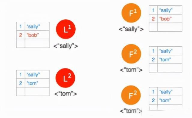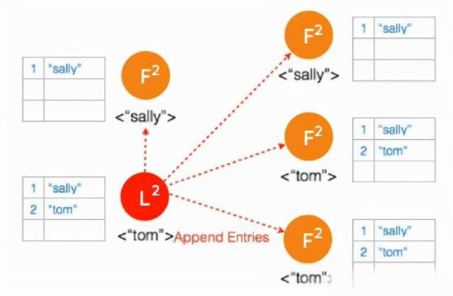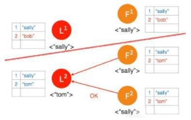 ⑥ 客户端数据 “tom” 发到新的 Leader2,并通过和上节网络状态下相似的过程,同步到另外两个 Follower;但因为这个 Partition 有3个节点,超过半数,所以数据 “tom” 都 Commit 了。