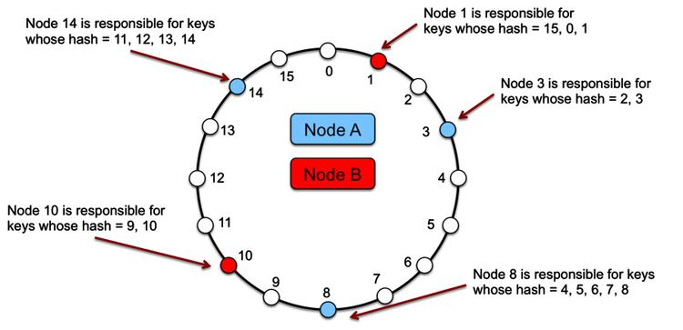 通过对数据项的键进行哈希处理以产生其在环上的位置,然后顺时针遍历环以查找位置大于该项位置的第一个节点,将每个由键标识的数据项分配给节点。与节点关联的节点是数据项的位置。
