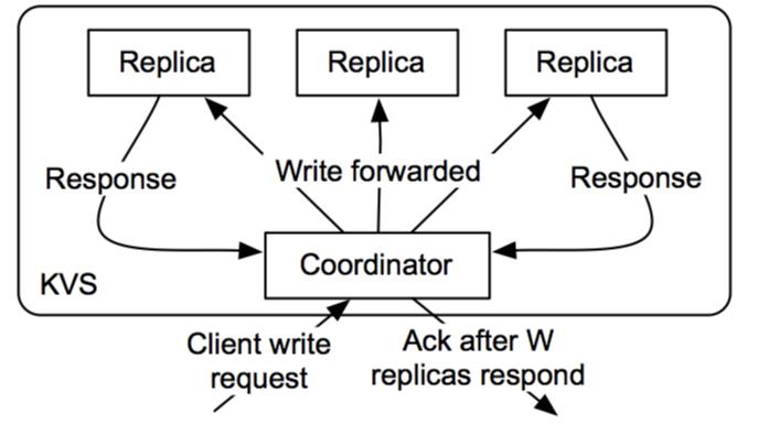 Dynamo 将写入复制到系统中其他节点的草率quorum,而不是像Paxos那样的严格多数quorum。所有读/写操作都在首选项列表中的第一个NN正常节点上执行,该节点可能并不总是在遍历一致哈希环时遇到的第一个NN节点。
