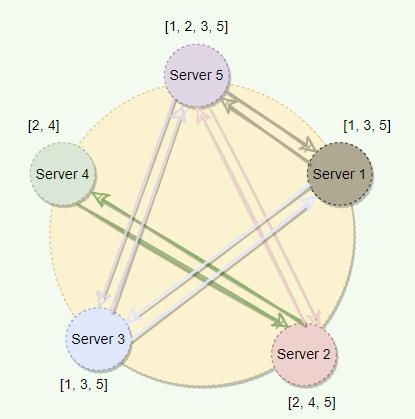 ⑦ 网络状态恢复,5个节点再次处于同一个网络状态下。但是这里出现了数据冲突 “bob" 和 “tom"。