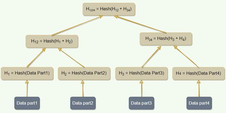 Merkle树是哈希的二叉树,其中每个内部节点是其两个子节点的哈希,每个叶节点是原始数据一部分的哈希。