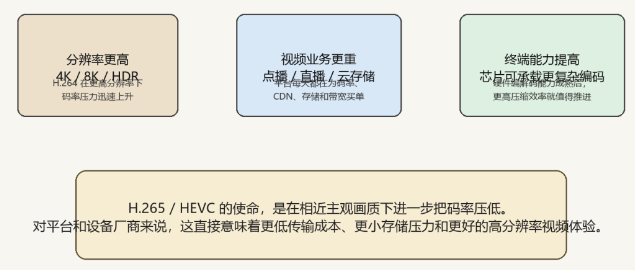 1. H.265 / HEVC 不是因为 H.264 失效才出现,而是因为视频分辨率、传输规模和存储成本压力都在快速上升。