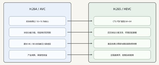 简单说,H.264 像是在 1080p 时代打磨得非常成熟的工程武器;而 H.265 则更像是在高分辨率时代继续深挖压缩潜力的一次系统升级。