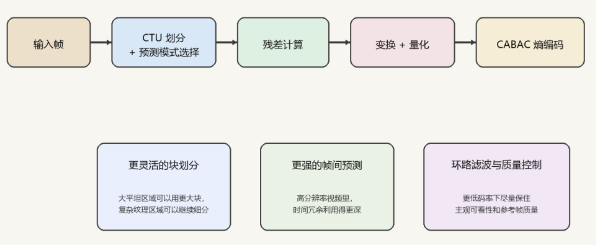 3. 它延续了 H.264 的混合编码思路,但在块划分、预测深度和压缩效率上更进一步。