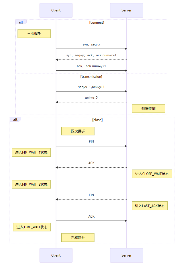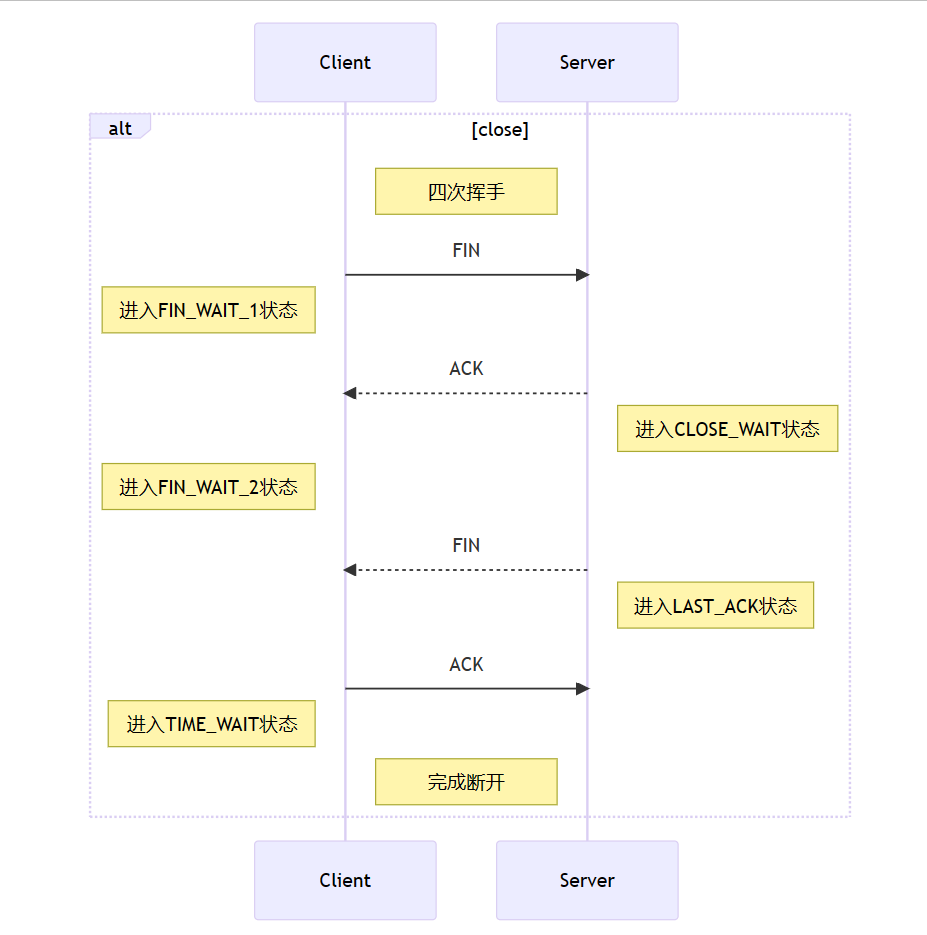 (3)四次挥手是 由发起方调用 close (),同时发送 FIN 包;接收端接收到 FIN 包返回 ACK 包,接收端发送 FIN 包;发起方接收到 FIN 包返回 ACK 包;完成断开。