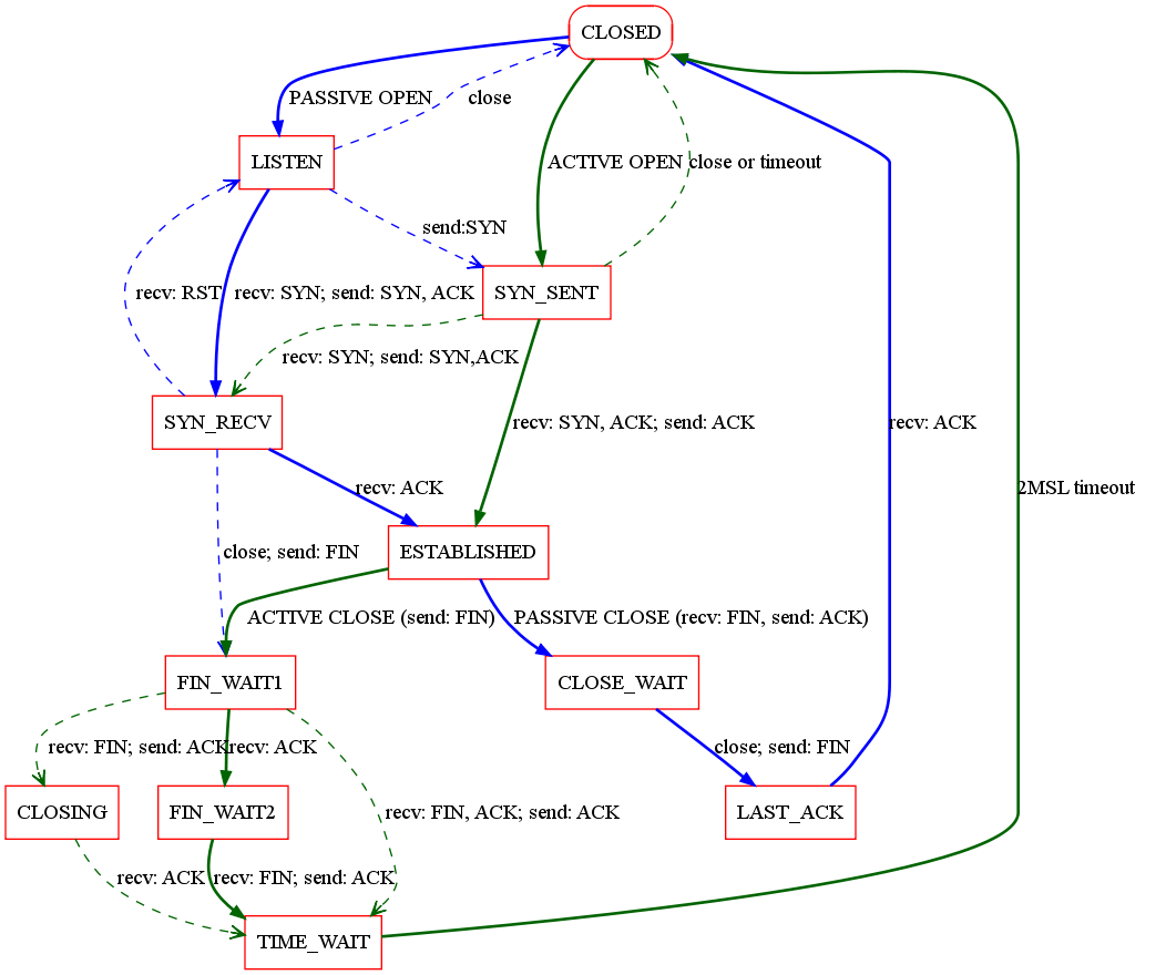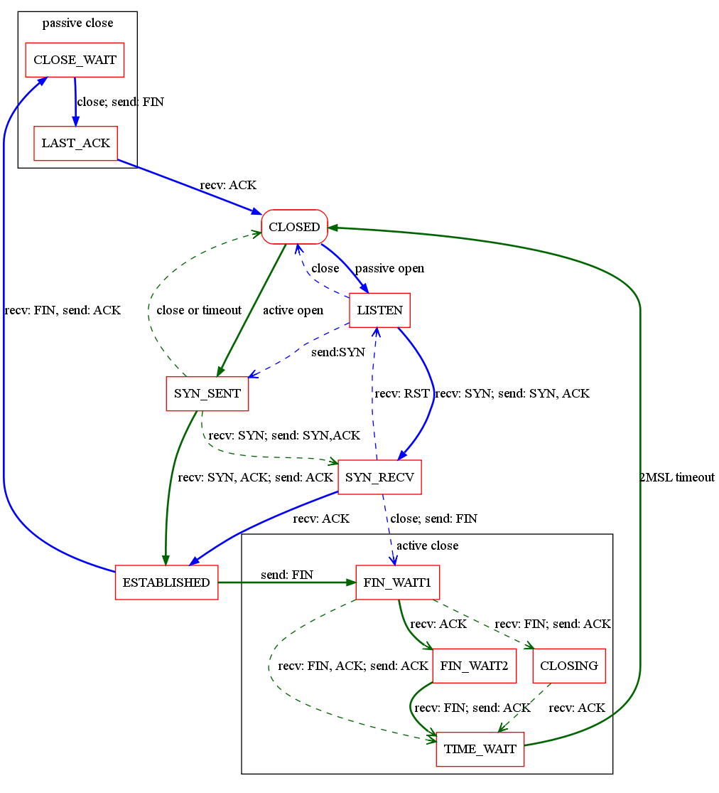 (4)理解 TCP 的状态转换图。LISTEN 状态到 SYN_RCVD 状态和 SYN_SEND 状态,如何进入 ESTABLISHED 状态;四次挥手 FIN_WAIT_1、FIN_WAIT_2、TIME_WAIT、CLOSING 直接的转换,CLOSE_WAIT 和 LAST_ACK 的处理等。