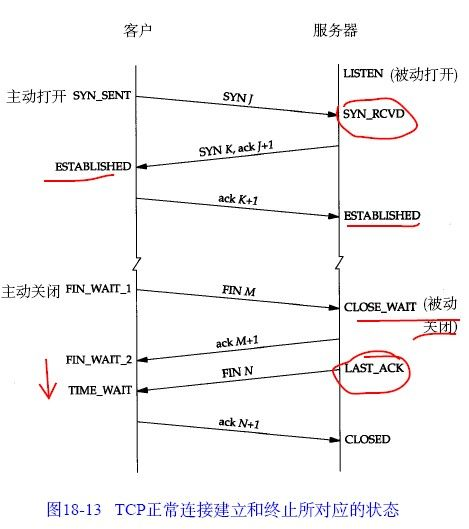 由于TCP连接时全双工的,因此,每个方向都必须要单独进行关闭,这一原则是当一方完成数据发送任务后,发送一个FIN来终止这一方向的连接,收到一个FIN只是意味着这一方向上没有数据流动了,即不会再收到数据了,但是在这个TCP连接上仍然能够发送数据,直到这一方向也发送了FIN。首先进行关闭的一方将执行主动关闭,而另一方则执行被动关闭,上图描述的即是如此。