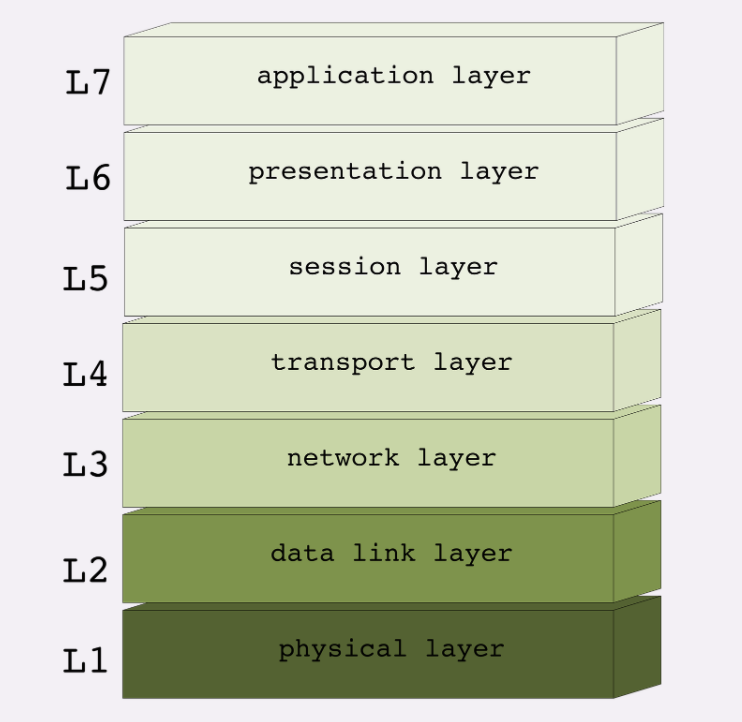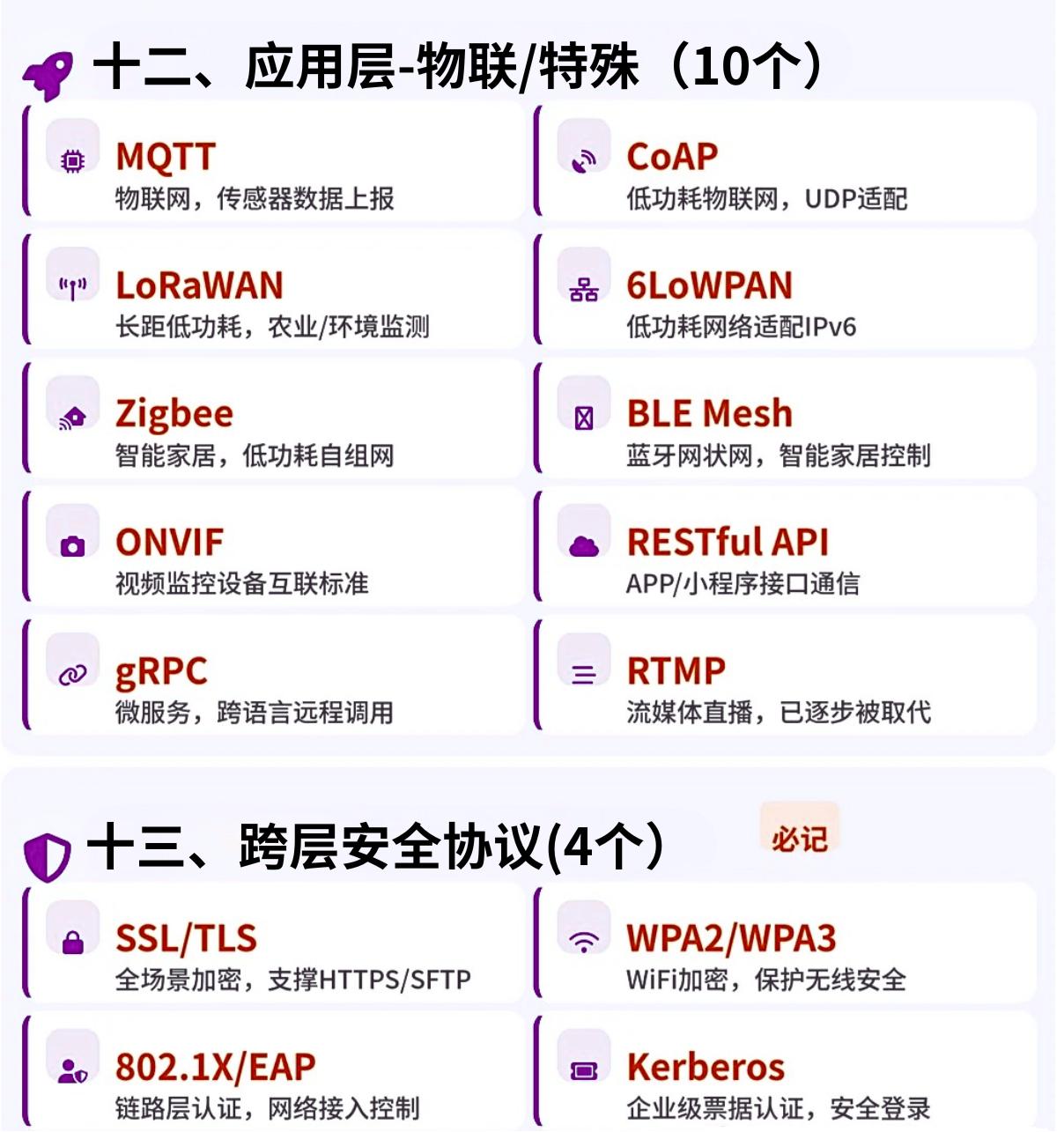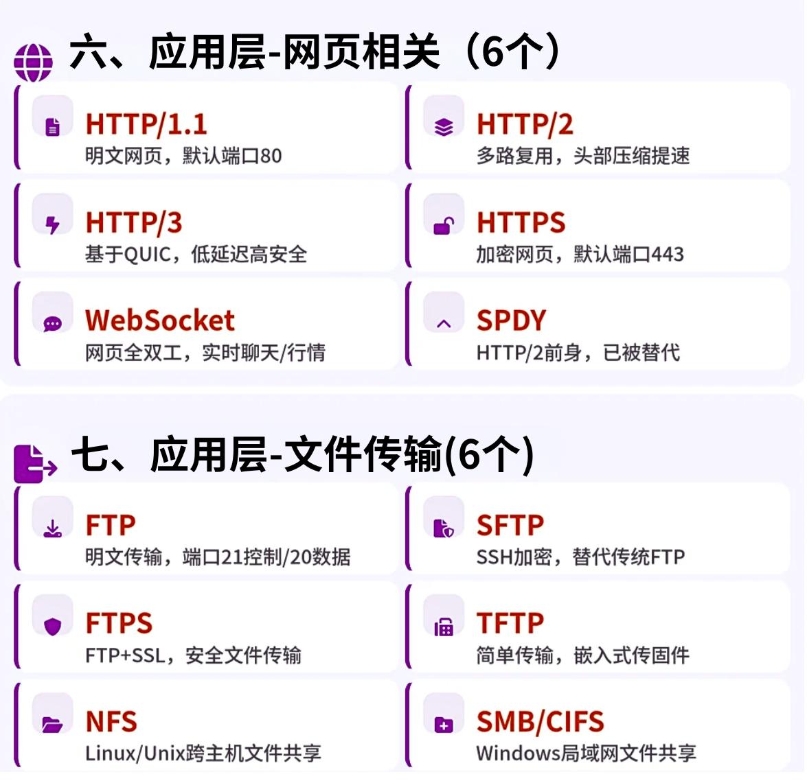 | 7 | 应用层 application layer | 例如HTTP(超文本传输协议)、SMTP(简单邮件传输协议)、SNMP(简单网络管理协议)、FTP(文件传输协议)、Telnet、SIP(会话发起协议)、SSH、NFS(网络文件系统)、RTSP、XMPP、Whois、ENRPTLS(传输层安全性协议)。 |