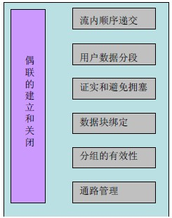 SCTP功能:SCTP 的功能主要包括:偶联的建立和关闭、流内消息顺序递交、用户数据分段、证实和避免拥塞、消息块绑定、分组的有效性和通路管理。