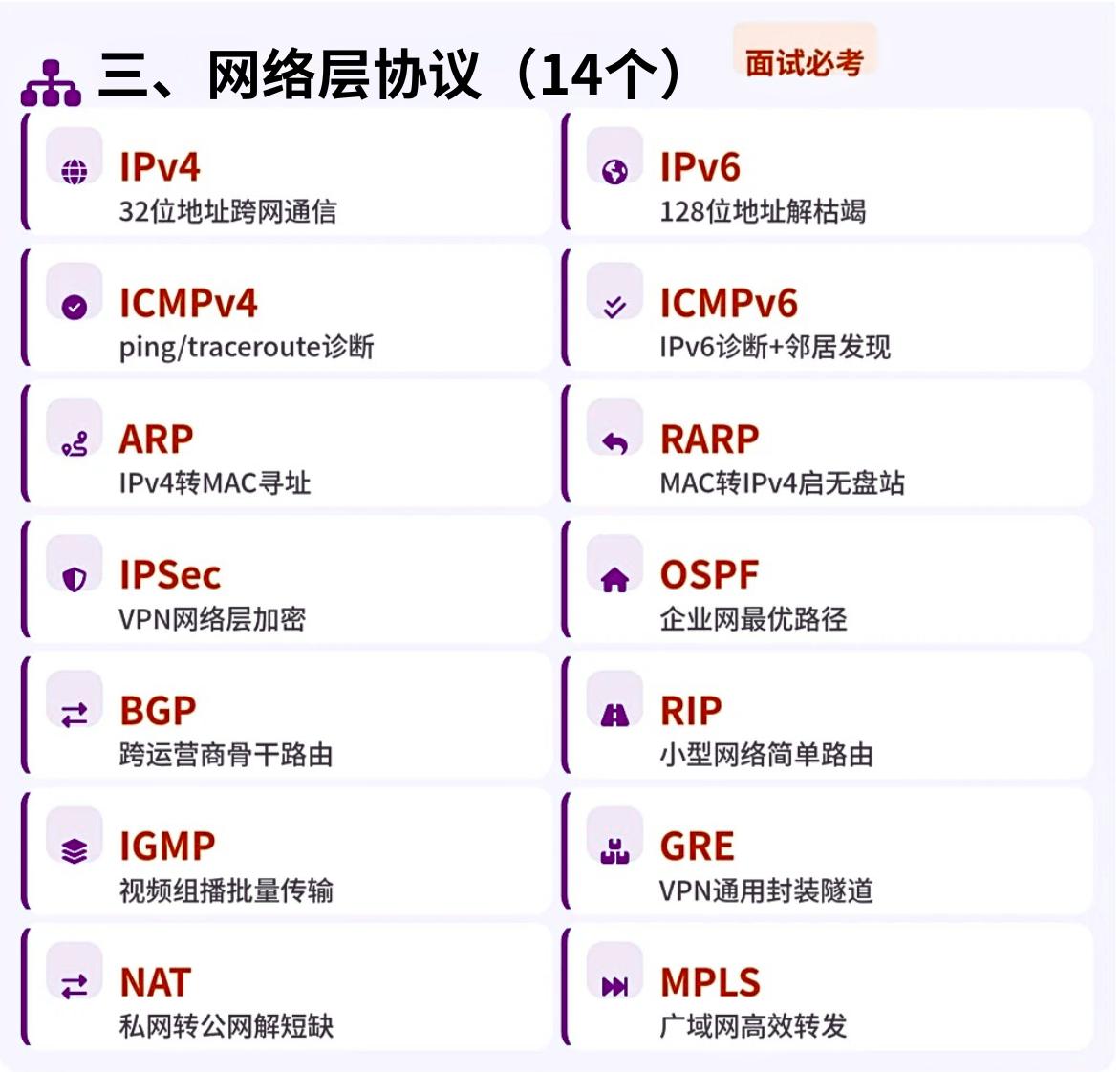 | 3 | 网络层 network layer | 例如IP(网际协议)、ICMP(互联网控制消息协议)、IPX(互联网分组交换协议)、BGP(边界网关协议)、OSPF、RIP(路由信息协议)、IGRP、EIGRP、ARP(地址解析协议)、RARP、X.25。 |