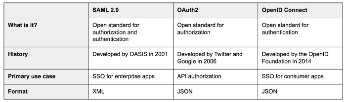 SAML是三者中最古老的标准,最初于2001年开发,其最新的主要更新发布于2005年.SAML,发音为“sam-el”,代表安全断言标记语言。它是一个提供身份验证和授权的开放标准。与其他两个标准的术语类似,SAML定义了一个主体,即最终用户尝试访问资源。有一个服务提供程序,它是委托人试图访问的Web服务器。还有一个身份提供者,它是拥有主体身份和凭据的服务器。